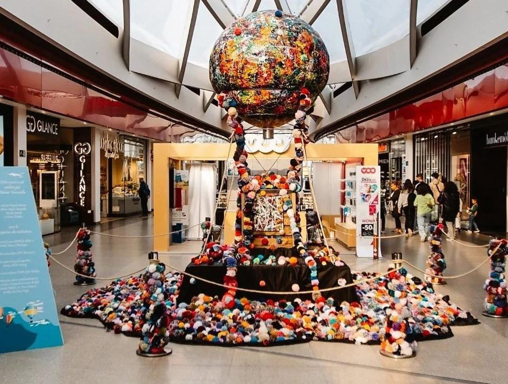 J'ai eu la chance de pouvoir imaginer et créer une oeuvre collective pour la Médiacité. Ainsi, avec la participation de Vincent Leruth, un ferronnier liégeois pour la structure et l'aide des citoyens pour créer 50 000 pompons, j'ai imaginé cette montgolfière et réalisé cette boule de 2m de diamètre. Ensuite, j'ai fait l'assemblage de toutes les parties de l'oeuvre. Cette montgolfière évoque le voyage, un voyage lent, au rythme du vent. Les pompons sont le symbole de la différence, tous unis pour un même voyage tout en douceur et en couleur.